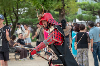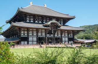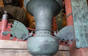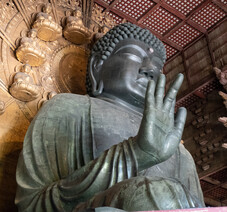 It's a hot day and I'm already sweating profusely at 10am. I pass through Nara Park on my way to Todaiji Temple. Lots of people are buying food and feeding the deer. After about 3/4 mile walk I pass through the great south gate and eventually get to the main hall where the Big Buddha is located. It's the world's largest bronze statue of the Buddha. Originally completed in 752, since then there have been a number of fires, earthquakes, or other disasters that have required reconstruction efforts.