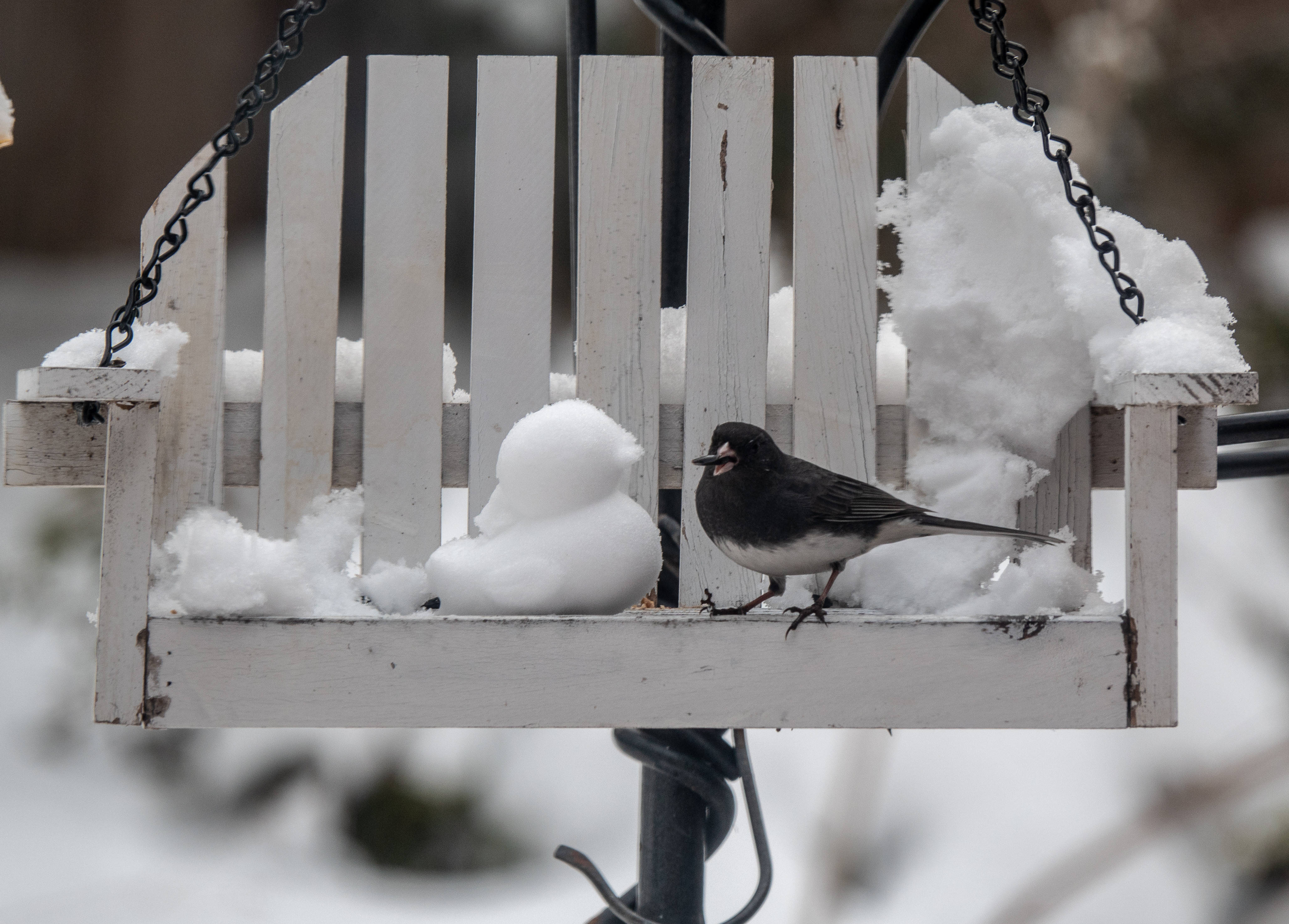 These are regular Westchester winter visitors pecking around on the ground below the yard feeders. We also saw a few in Yellowstone NP during our 2013 SMRA birding trip. The western ones were "Pink-sided" while our eastern birds are "slate-colored".