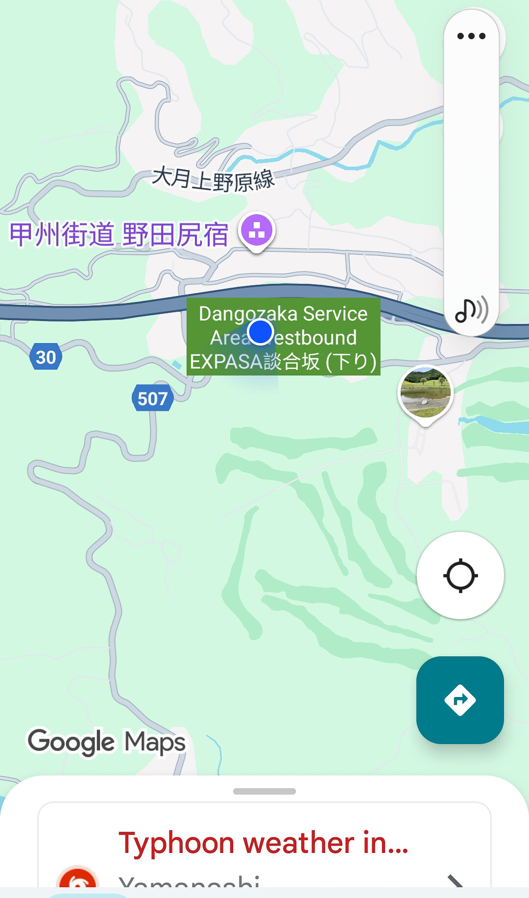 We headed west toward Mt. Fuji with a stop at the Dangozaka Service Area. I did a screenshot of the map to see where we were, but didn't notice the Typhoon weather alert at the time. The trip was mildly impacted by the typhoon the next day, more on that later.