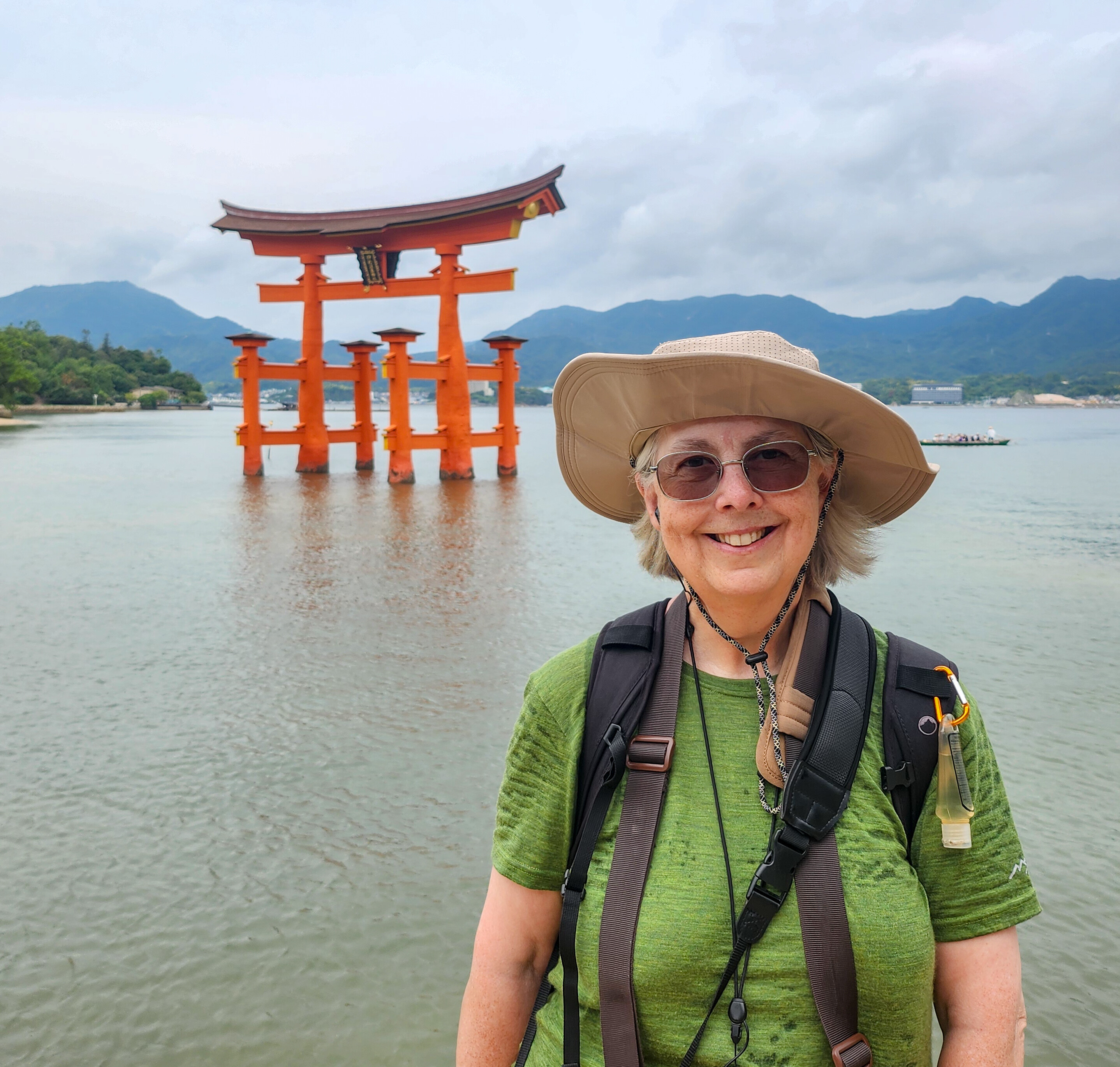 I spot a few birds from the ferry, and catch sight of the large vermilion Torii gate as the ferry approaches the dock. The tide is in, and the Torii gate appears to be floating on the water. At low tide, you can walk up to the gate, but it is much more beautiful at high tide.