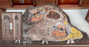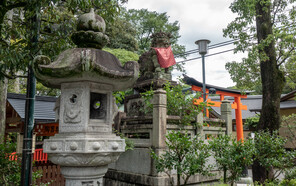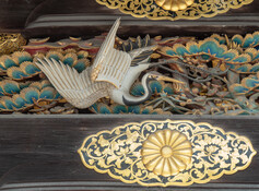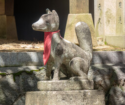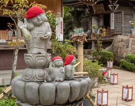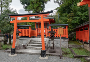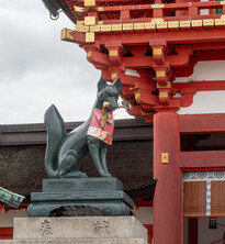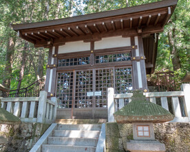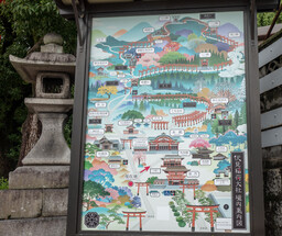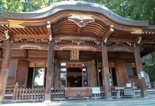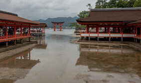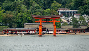 The main shrine is dedicated to three female deities: Ichikishima-hime-no-mikoto, Tagori-hime-no-mikoto, and Tagitsu-hime-no-mikoto. They are the gods of the sea, transport, fortune, and the arts. The vermilion O-Torii gate is a short distance out to sea. Historically visitors came by boat and passed through the gate on their way to the shrine.