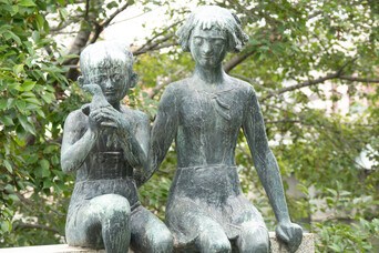 The weather is cloudy and gray which seems appropriate for touring this sad memorial area. A particularly moving sight is the Children's Peace Memorial statue. The main statue depicts Sadako Sasaki holding a wire crane above her head. She is one of the tens of thousands of children who died of radiation poisoning from the A-bomb, Little-Boy.