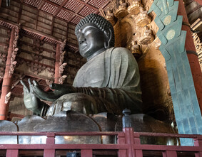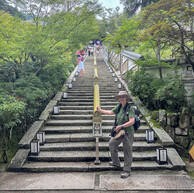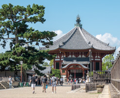 It's a hot day and I'm already sweating profusely at 10am. I pass through Nara Park on my way to Todaiji Temple. Lots of people are buying food and feeding the deer. After about 3/4 mile walk I pass through the great south gate and eventually get to the main hall where the Big Buddha is located. It's the world's largest bronze statue of the Buddha. Originally completed in 752, since then there have been a number of fires, earthquakes, or other disasters that have required reconstruction efforts.