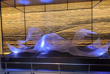 The Hakukokan Center tour begins at a small museum with workers demonstrating the process of pounding and stretching gold into very thin sheets. I like the exhibit with a thin sheet that is almost as tall as me. Translating its info sign says that: A gold alloy 1/3 the size of a 10Yen coin is stretched to the size of tatami mat and it's 1/10,000 of a mm thick.