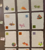 We gathered in groups of 7 and were each given small cups with little bits and bobs that we would use for our later designs. I thought one of mine was a frog, but I had it upside down and it was actually a crane. A second design I thought was a weird face mask, I was also looking at upside down. It turned out to be a stylized Gassho-style house, the cutouts I thought were eyes and mouth were windows and doors, and the "hair" was the thatched roof. My third design bit was a pink dog, but we'll call it salmon colored.