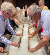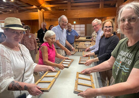 My group went first and we each had a wooden rack with a fine mesh sieve that we carefully dipped into the gray liquid. Warnings were given to keep the rack vertical when going into the liquid, and rotate it just so before holding it horizontally for a minute or two before repeating the process 3 times. The thick liquid collected on our mesh rack magically began to turn into paper. Before they were dry, I carefully arranged my colored design elements on top. Fortunately, and alert pro at the shop noticed my upside down elements and we were able to right them before things dried.